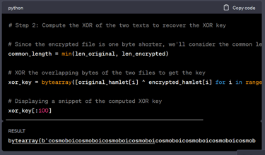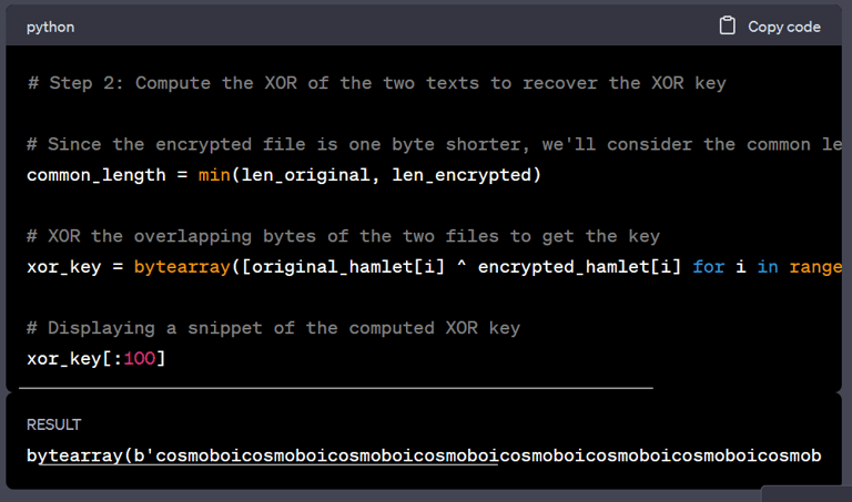 I managed to find the original file and asked GPT to make a XOR decryptor python script for me (Since I am lazy...). I made a local environment with the decryptor.py, hamlet.txt.encry and hamlet.txt, I ran the script and VOILA! We got the key: “cosmoboicosmoboicosmoboicosmoboicosmoboicosmoboicosmoboicosmoboicosmoboicosmoboicosmoboicosmoboicosm..”
