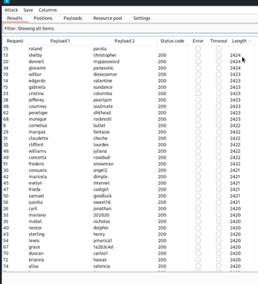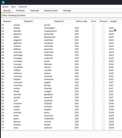 I initiate a forked intruder attack [You can read about it and learn how to execute such an attack in the tips menu above!] and it works perfectly... at least for the first few attempts. However, I suddenly notice that most of the lengths are the same, which is peculiar as it should print an error message with the username we're testing.