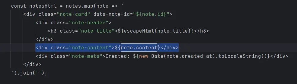 As usual, I opened the app in Burp Suite and started exploring the different endpoints. Analyzing the source code (the app.js) i found this, which directly injects content into the div without any sanitation.