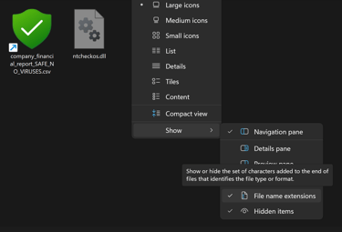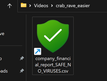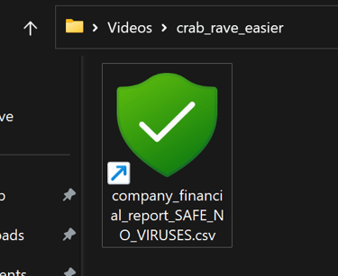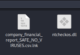 When opening the tasks, we are represented with 2 files. “company_financial_report_SAFE_NO_VIRUSES.csv.lnk” and “ntcheckos.dll” (Which we can clearly see in the Linux distro, but Windows by default hides the name extension and hidden files. I always have these visible).