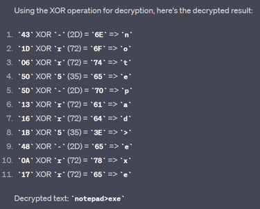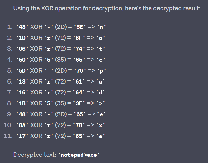 This is sadly where my Reverse engineering skills comes to an end, and I had to ask GPT to help me understand what is going on in the “crab_rave::litcrypt_internal::decrypt_bytes” function. It explained to me that the function is using XOR and the key, shown in clear text to decrypt it. It proved it by making a short PoC (After I managed to get the “&DAT_103cd950” content (By double clicking it), which I used further to explore the other. It could be bullshitting me for all I know, but I also know that this technique worked for me later.