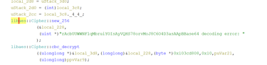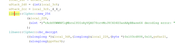 Now I just need to decode/decrypt this string! To do this, I dug deeper into the program and looked for anything that could hint on how the string is decoded the intended way. I found AES being used and a curious string to it… (I am very embarrassed to say that I spent hours understanding how this was used, until I realized that the first 32 bytes are the key, the rest is to throw you off).