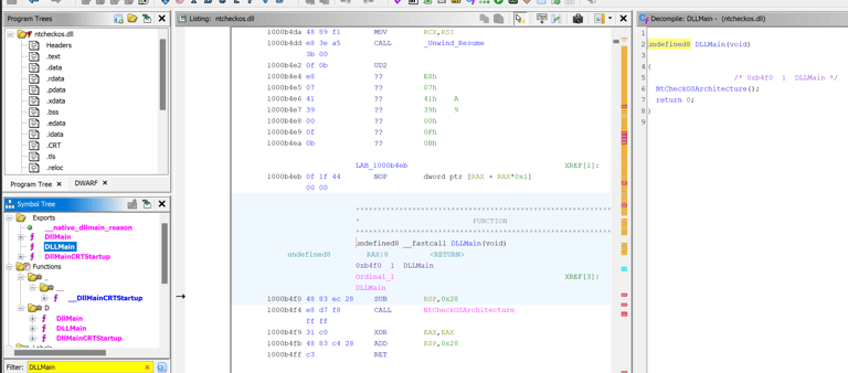 It seems to be running the system32 cmd.exe, pinging itself… But also using the ntcheckos.dll -> DLLMain function. But what is the DLLMain function doing? Let us boot up good’ol Ghirda and have a look.