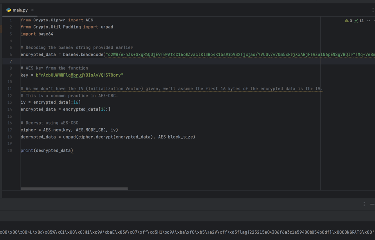 I found a template Python script for decrypting the AES in CBC mode (And again… I managed to get plenty of errors since the message was not UTF-8, almost stopped trying this, thinking it was a new rabbithole) but then managed to print the raw bytes and VOILA! THE FLAG!!