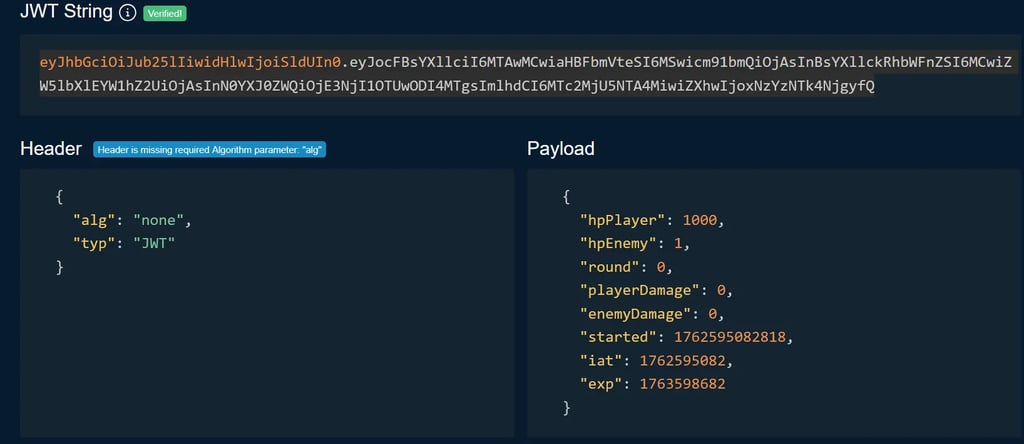 eyJhbGciOiJub25lIiwidHlwIjoiSldUIn0.eyJocFBsYXllciI6MTAwMCwiaHBFbmVteSI6MSwicm91bmQiOjAsInBsYXllckRhbWFnZSI6MCwiZW5lbXlEYW1hZ2UiOjAsInN0YXJ0ZWQiOjE3NjI1OTUwODI4MTgsImlhdCI6MTc2MjU5NTA4MiwiZXhwIjoxNzYzNTk4NjgyfQ.