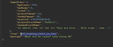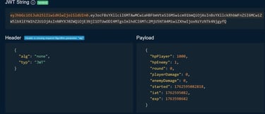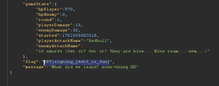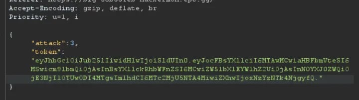Open Burp Suite and use the proxy web browser. Let us analyze what is going on in this battle.. When performing an attack, I notice an attack value 3 and a token. At first glance, I mistook it for some sort of session token, until i put it into a JWT debugger.