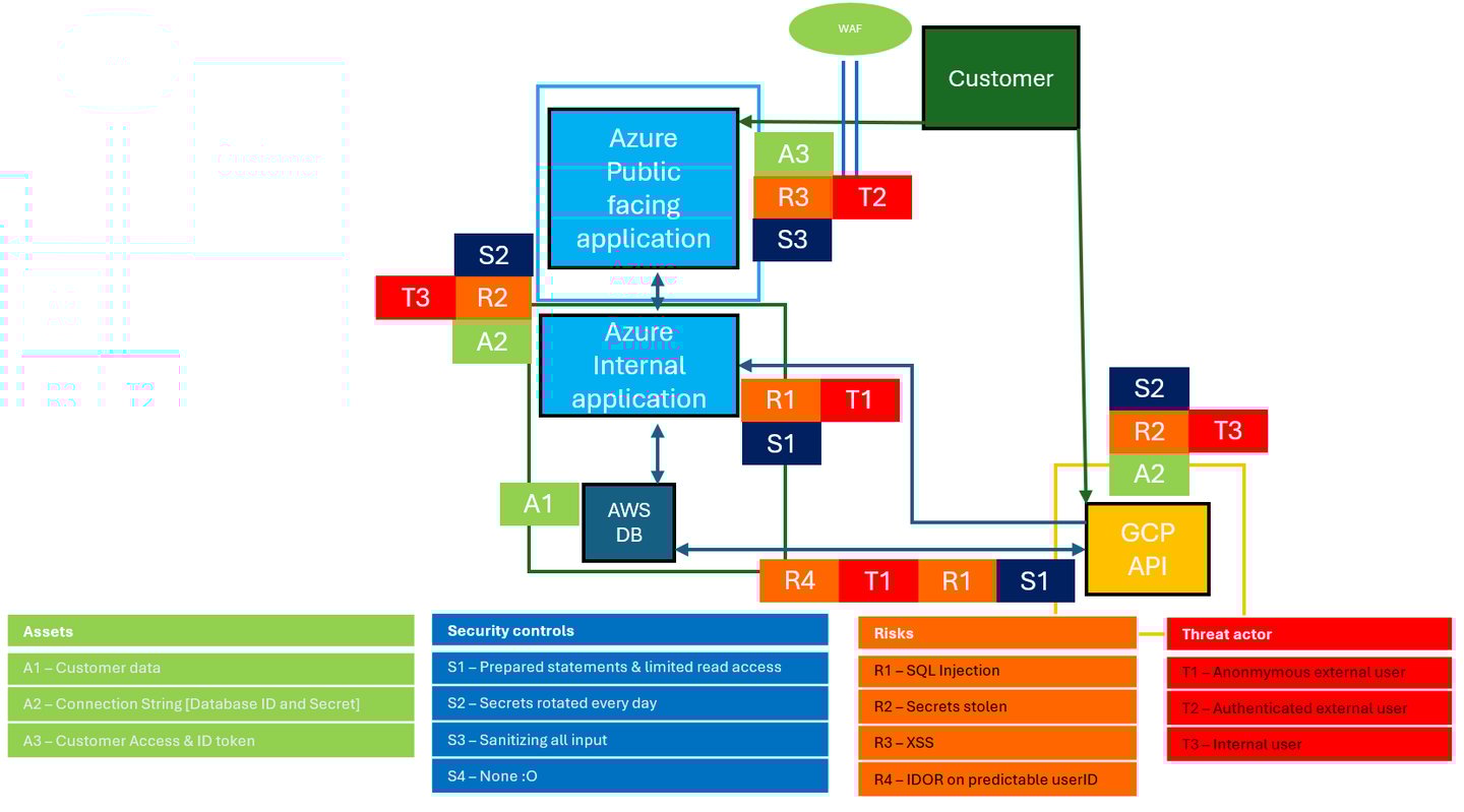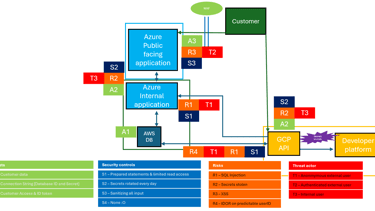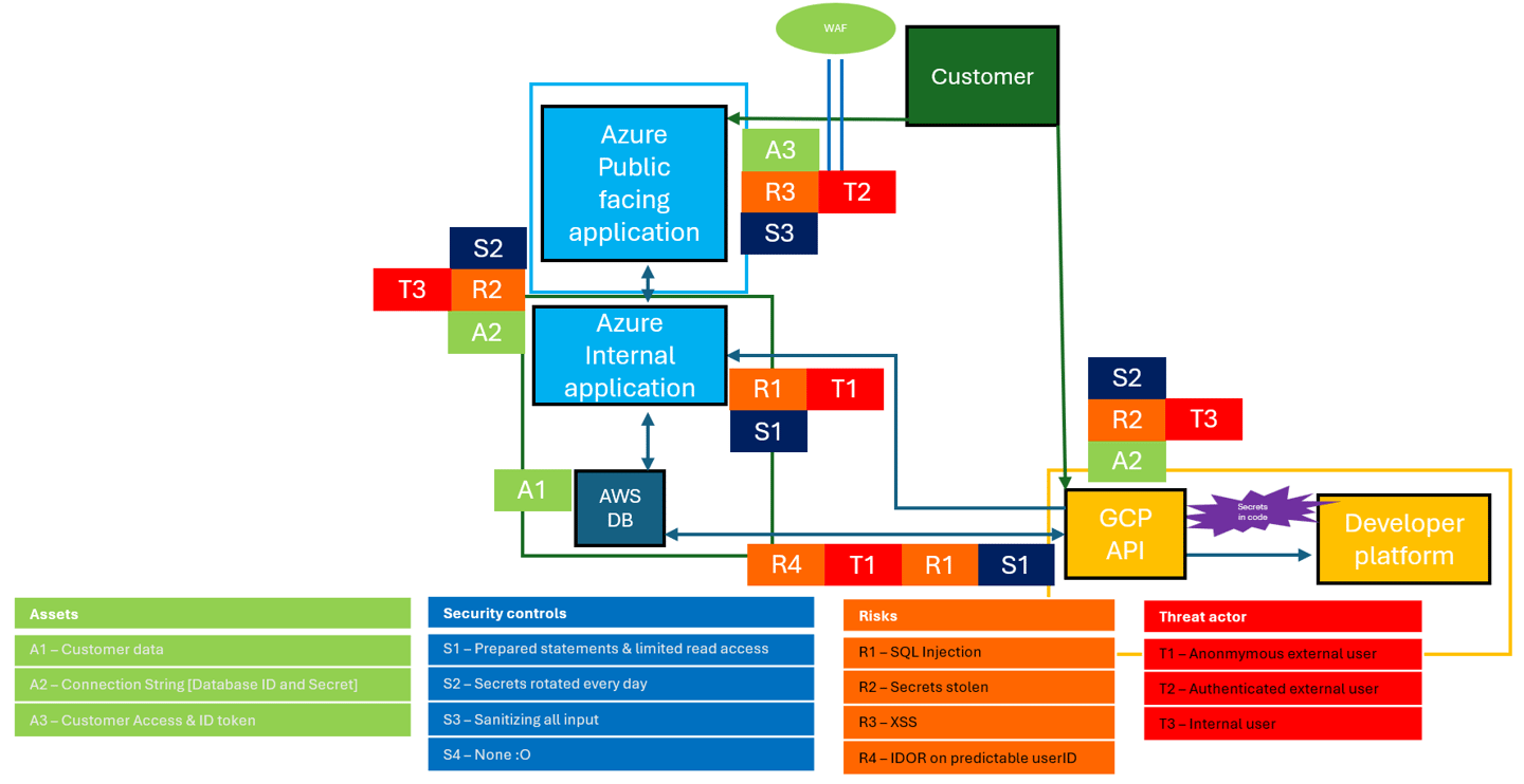 The risks are anything that can potentially cause harm to the assets mapped in phase one. In security we follow the CIA triad, and this a good opportunity to bring that into the discussion. If you have a connection string with credentials in source code, and the connection is being used to access a database with customer information, what would happen if a threat actor got their hands on it? Could they access the data with the connection string alone? Is it reachable from internet? Could they easily share it and gain persistence? Does the use connected to the connection string have full CRUD (Create, read, update and delete) rights so they could break the integrity? What will break the availability. Can it be held ransom somehow? Could they delete the information? Or somehow block all access to it? And in the end, map the threat actor. Can the source code somehow be reached from the internet without any authentication, then that in our example, it would be a "T1", if it is an inside threat that could do it, it would be a "T3". This is to understand the probability of the risk happening.