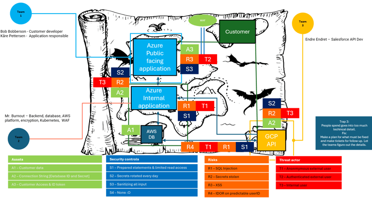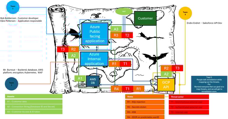 As with most things, hosting a good Threat modelling session is something that comes with experience. If you are new to threat modelling, I highly recommend making your own flow diagram of a fictional application and practice mapping Assets, Risks and Threat Actors. I will make a another blog post where we go through a fictional flow diagram in detail.