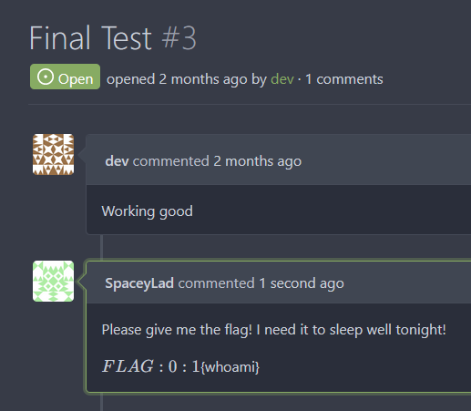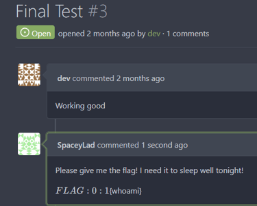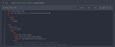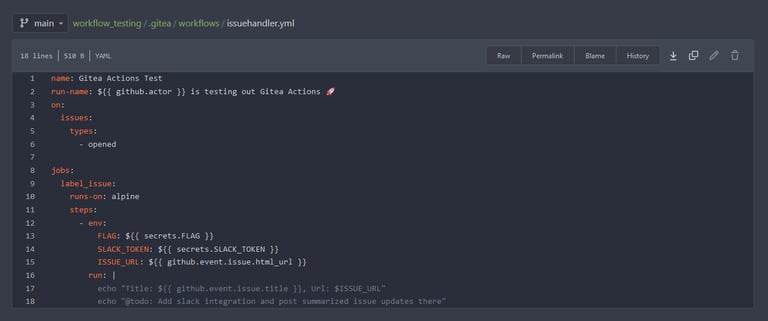 Looking closer at what they have inside of them, I notice a YAML file with some interesting data inn it… It seems to be storing the content of a FLAG file (Or variable) from the server into a local variable as it is starting its action when someone makes an issue… (This is how I interpreted it, feel free to correct me!)