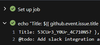 I went through the application again and this time was more active. Writing comments, trying to clone the repo (Lol that did not work) and finding sneaky ways of injecting commands. I then tried to see if I could sneak inn commands in the title and data in an issue with ${FLAG}, and I got ***… Which is interesting, I did not expect such a weird value. After searching it up, I found out that this is a security measure done to avoid secrets accidentally being revealed in when printing variables! I took the challenge and tried to see if I could sneak the flag out myself. I tried a couple of failed attempts, until I tried ${FLAG:0:1} (The first byte of the variable)… And … I GOT AN “E”! I then tried the next 4 bytes and got “EPT{“! 😁