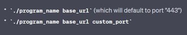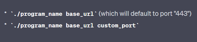 Decompiling the program in Ghidra, I notice that the program is taking in 2 parameters. To understand what it needs, I give the decompiled to GPT, which quickly pointed out that it wants a URL and a port. So it should look like this: