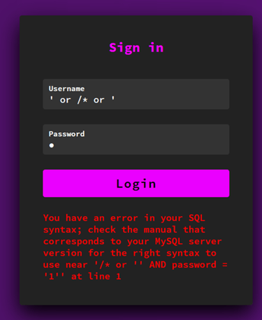 login all together. I remembered that commenting out the password part is an effective way of just focusing on the username part of the login. So I crafted this syntax. “' OR '1'='1' -- ” (Note that the space behind the “—” is very important to actually comment out the password section.